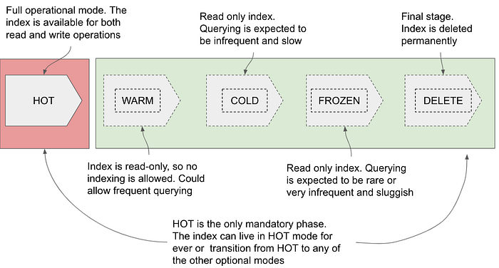 - Cold — The index is in read-only mode. Similar to the warm phase, where indexing is switched off, and it’s open for querying, albeit the queries are expected to be infrequent. When the index is in this phase, the search queries might result in slow response times.